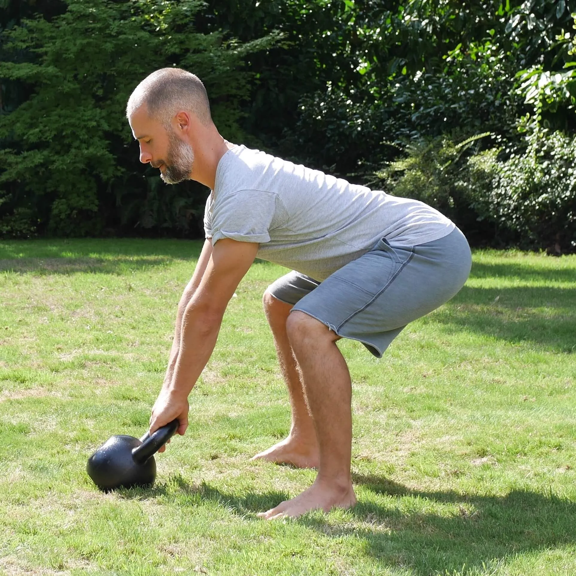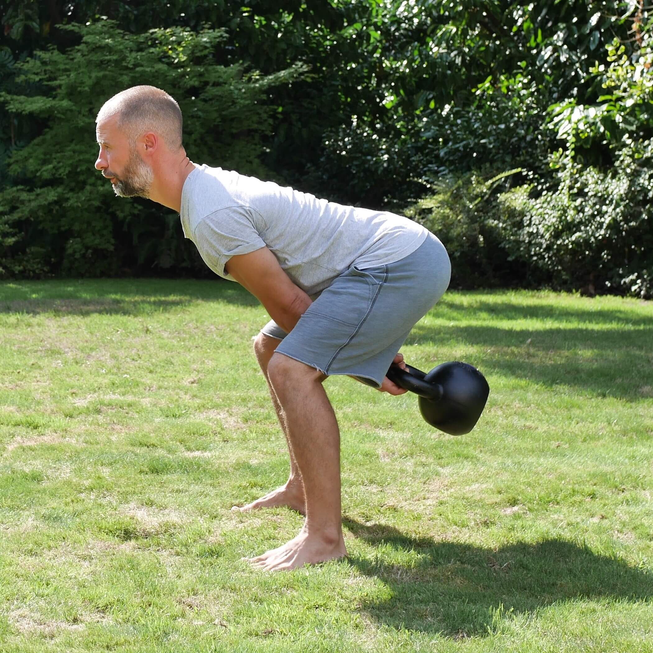 - Keep your shoulders away from your ears. It’s the hamstring and glutes which drive the kettlebell. Don’t try to lift it with your upper body.