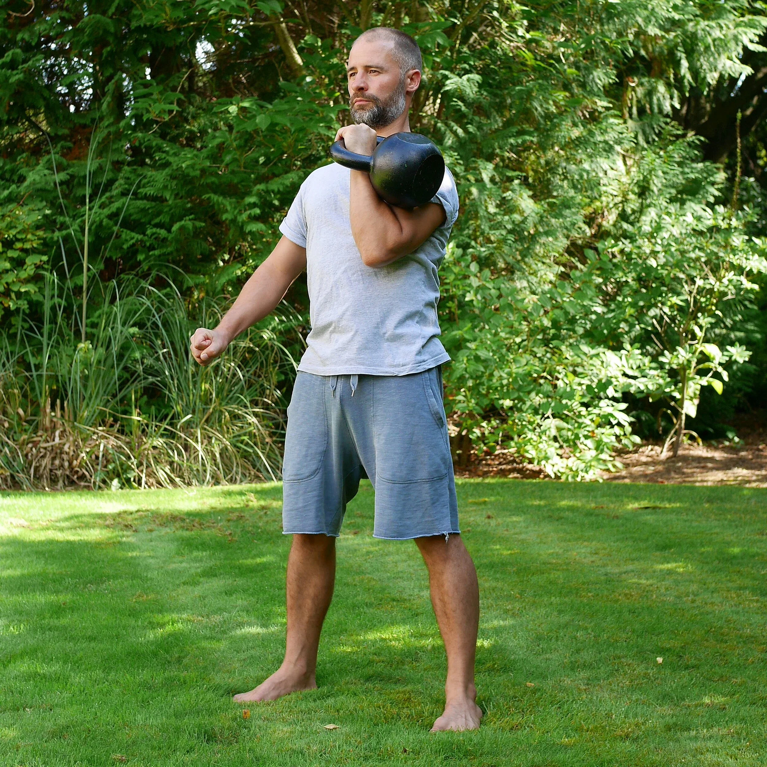 Clean the kettlebell into the rack position. Remember your press is only as good as your clean.